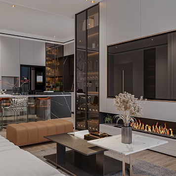 Мишель объединяет закрытые системы хранения и открытые ниши для декора. Центральная часть оформлена под телевизор с декоративным камином внизу, а сбоку встроен шкаф-витрина со стеклянными фасадами в алюминиевой рамке и мягкой внутренней подсветкой — для размещения бокалов и бутылок.